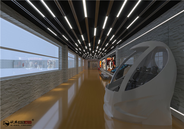 項目中,空間的主場是長廊,镹臻裝飾設計師在展示區采用了直線及燈光的表現手法充分利用墻面區域和頂面區域,展示區頂部設計一個星空頂,充分展現科技感,根據具體展示需要,結合圖文展板和實物進行展示,使觀者對消防內容有直觀了解。
